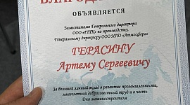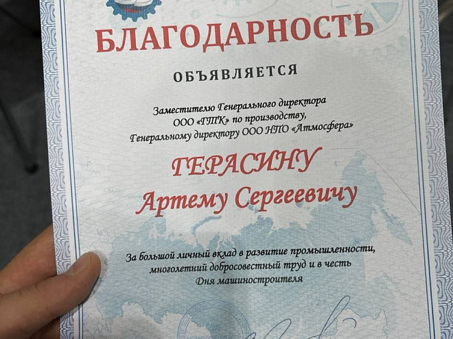 Заместитель генерального директора ООО «ГТК», генеральный директор ООО «НПО «Атмосфера» Артем Герасин был удостоен Благодарности от Союза машиностроителей России. Заслуги руководителя компании-резидента Технопарка были отмечены на Международной специализированной технологической выставке «Сургут. Нефть и Газ – 2024», которая работала в период с 26 по 27 сентября - в преддверии Дня машиностроителя (29 сентября).