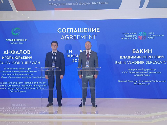 18 октября на Международном форуме-выставке «InRussia - 2024» Технопарк высоких технологий Югры подписал Соглашение о сотрудничестве с промышленным технопарком «СИНЕРГИЯ». Со стороны Технопарка Югры в церемонии участвовал Игорь Анфалов, заместитель директора по перспективному планированию и проектной деятельности, со стороны технопарка «СИНЕРГИЯ» - Владимир Бакин, генеральный директор.