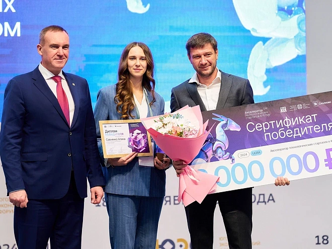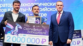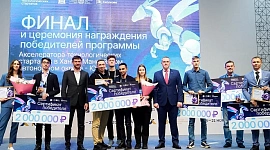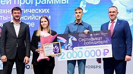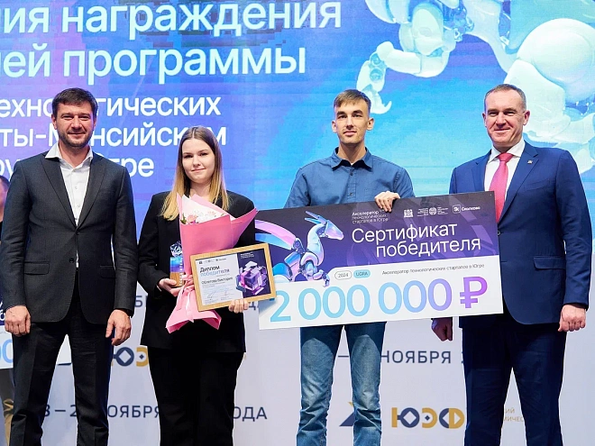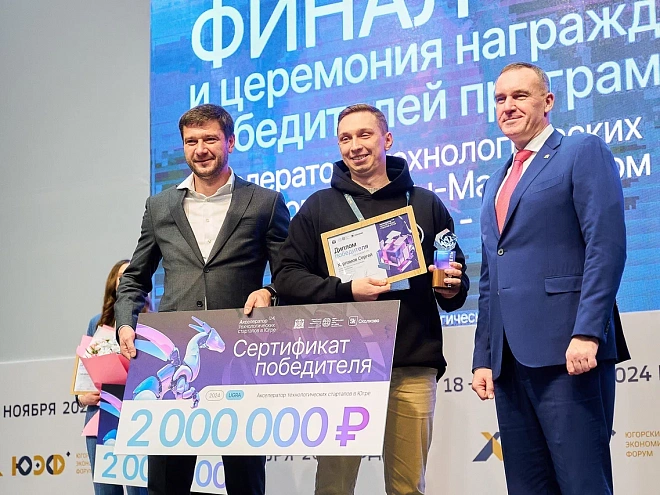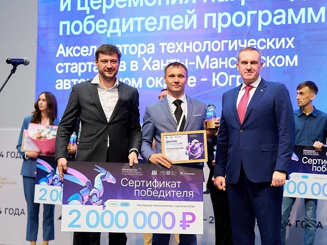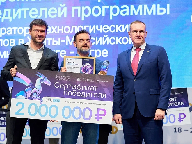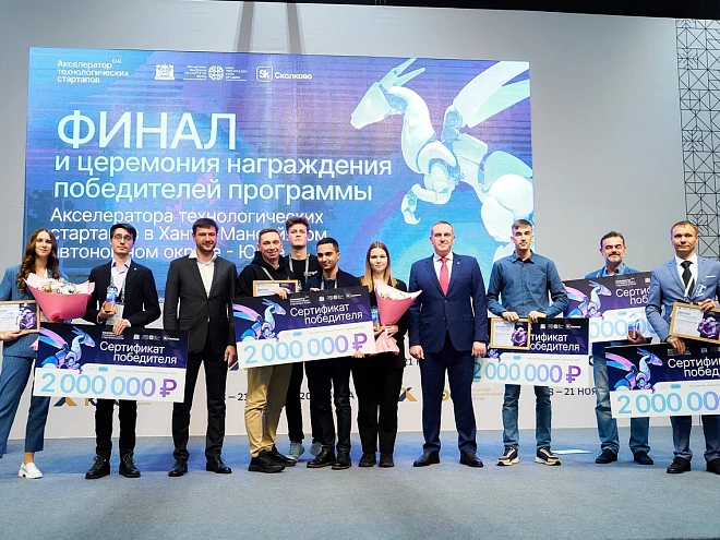 18 ноября в Ханты-Мансийске на главной сцене Югорского экономического форума состоялась Церемония награждения победителей IV сезона Акселератора технологических стартапов. Губернатор Югры Руслан Кухарук и заместитель председателя Правления по региональному развитию, главный управляющий директор Фонда «Сколково» Юрий Сапрыкин объявили пятерку победителей акселерационной программы текущего года и вручили грантовые сертификаты в 2 млн рублей на реализацию технологических проектов в Югре.